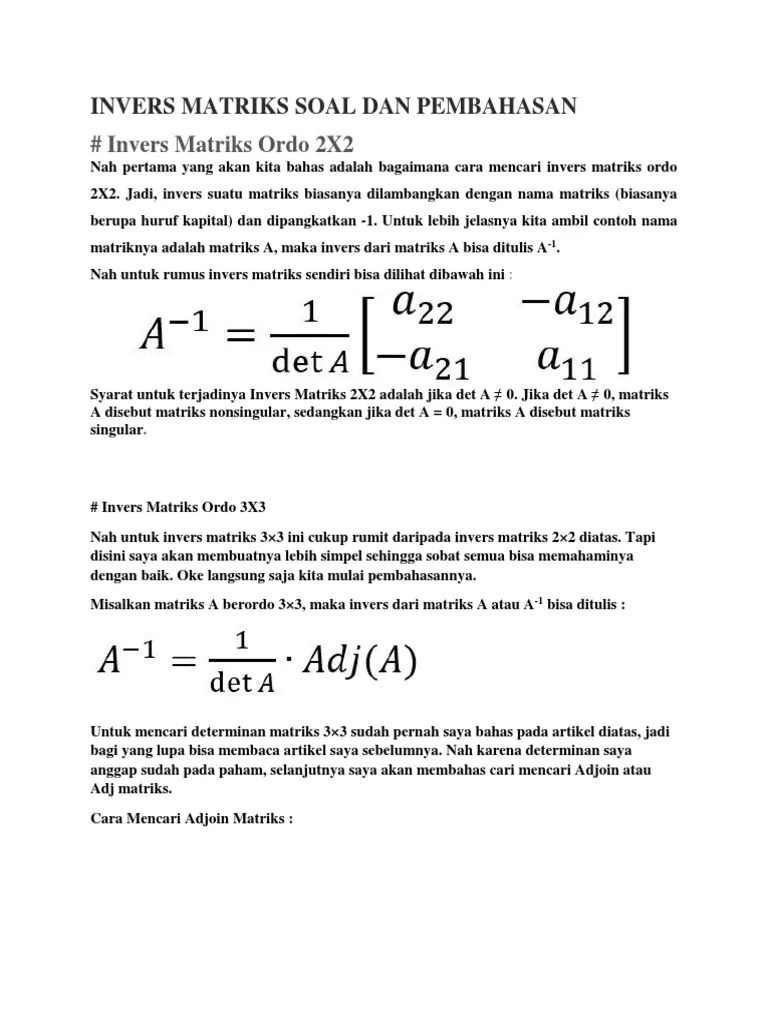 invers matriks ordo 3x3 dimana adalah dengan syarat ≠0. Jika matriks dan saling invers, tentukan nilai x! Invers matriks sendiri terdiri dari beberapa macam, salah satunya adalah invers matriks 2×2 dan 3×3. Contoh perkalian matriks, pertambahan dan pengurangan matriks, determinan matriks, invers matriks, dan transpose matriks. Invers matriks matematika sma dan smk, contoh soal invers matriks metode sarrus ordo 2x2, 3x3, disertai cara menentukan adjoint, determinan dari rumus invers matriks diatas dapat disimpulkan bahwa: