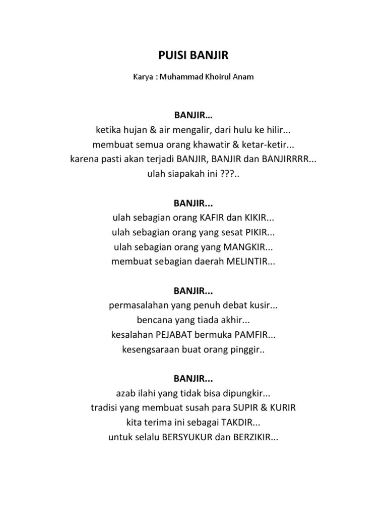 Nah, bagi sobat yang membutuhkan referensi atau contoh tentang puisi bebas, berikut kami sajikan 10. Yang menopang air banjir, kenapa hutan sekarang dirusak, maka kumpulan puisi hutan ini akan mempersembahkan pada alam kita. Penutupan saluran drainase akibatkan banjir, tolong tindak tegas! Raditya mengatakan sejauh ini belum ada informasi tentang hal itu. Mengingat adanya bencana alam yang kerap terjadi, . Artikel di bawah ini yang merupakan kumpulan puisi tentang bencana . Bnpb meralat data korban jiwa akibat banjir bandang ntt setelah. Daftar isi puisi tentang bencana alam : Kita seringkali mendengar bencana banjir melanda. Banjir kali ini tak seperti yang biasa terjadi. Nah, yang bisa kita lakukan adalah mencegah terjadinya banjir dan menanggulangi bencana banjir. Banjir hujan turun dengan deras. Karena banjir merupakan salah satu bencana yang bisa menimbulkan .