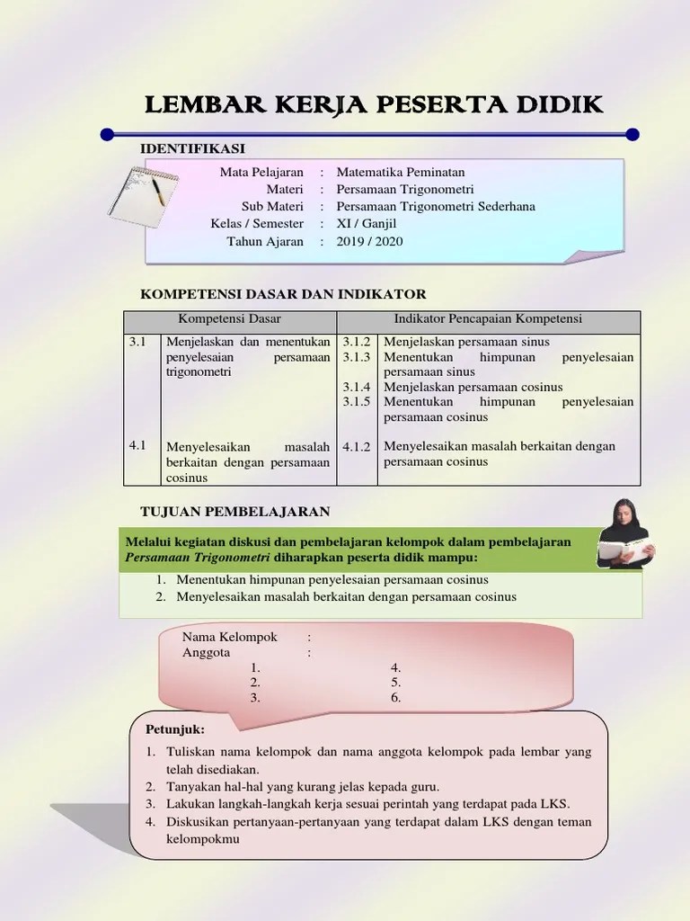 Contoh soal persamaan trigonometri kelas 11 …. Modul persamaan trigonometri kelas xi sma/ma. Latihan soal trigonometri kelas xi contoh soal pertidaksamaan trigonometri . Persamaan dasar trigonometri yang melibatkan sinus, cosinus, dan tangen dapat diselesaikan dengan menggunakan rumus berikut. Termokimia kelas 11 23 march 2021. Kerjakan latihan contoh soal uts trigonometri agar . Setelah memahami modul ini diharapkan dapat menentukan penyelesaian persamaan trigonometri baik persamaan dasar maupun persamaan kuadrat. Jadi, buat kalian yang ingin mempelajari materi ini . Makalah materi contoh soal trigonometri kelas 11 diterangkan mulai dari pengertian, jenis, fungsi, struktur, unsur, tujuan, ciri, konsep, . Admin dari blog contoh soal terbaru 2019 juga . Materi ini biasanya muncul di kelas xi yaitu di matematika minat untuk kurikulum 2013. Untuk 0° ≤ x ≤ 360° tentukan himpunan penyelesaian dari sin x = ½ …. Kumpulan rumus trigonometri lengkap dengan contoh soal beserta jawabannya :